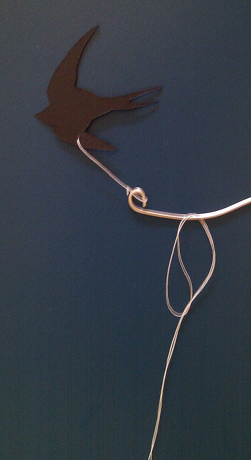 Next step is to cut out your preferred motive for your mobile, I chose swallows. Use the needle and thread to attach your motive to the thread, make a loop on the thread and hang it on the twisted ends. Like the pictures below.