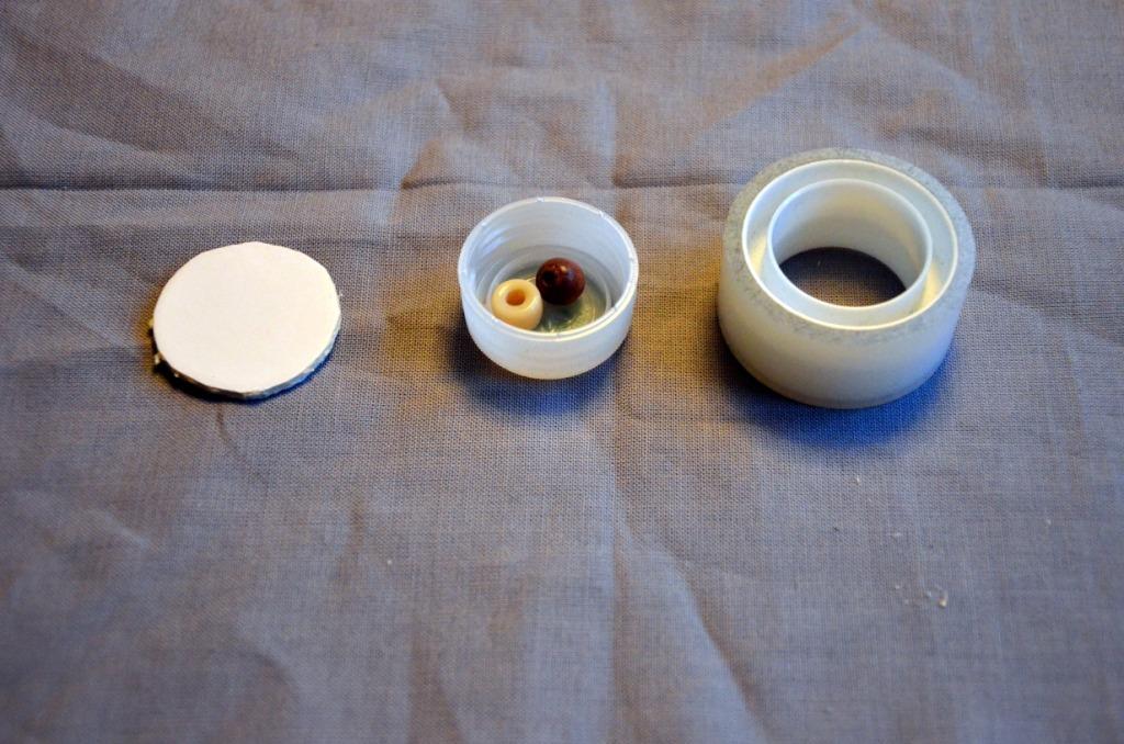 “Raslen” i guleroden er lavet af et låg til en vandflaske, to perler, et stykke skiltekarton samt tape. Bandt noglet snor omkring raslen bare i tilfælde af at tapen gav slip.