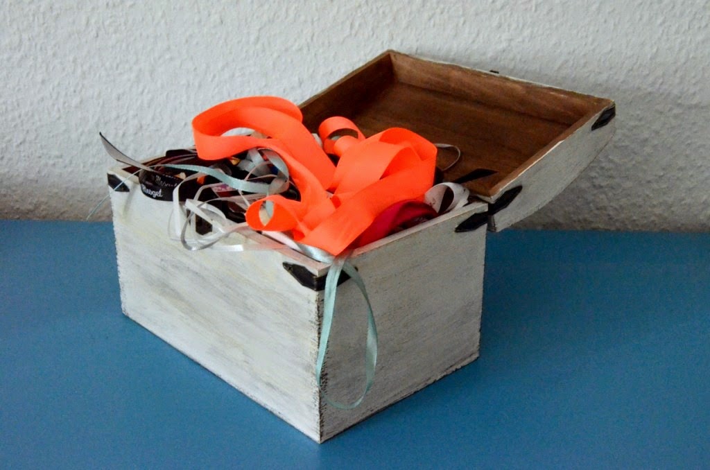 I found this idea at her blog to keep all the ribbons organized. I have used popsticle sticks from a craft store called Panduro Hobby . Use small needles to fasten the ribbon on the popsticle sticks.