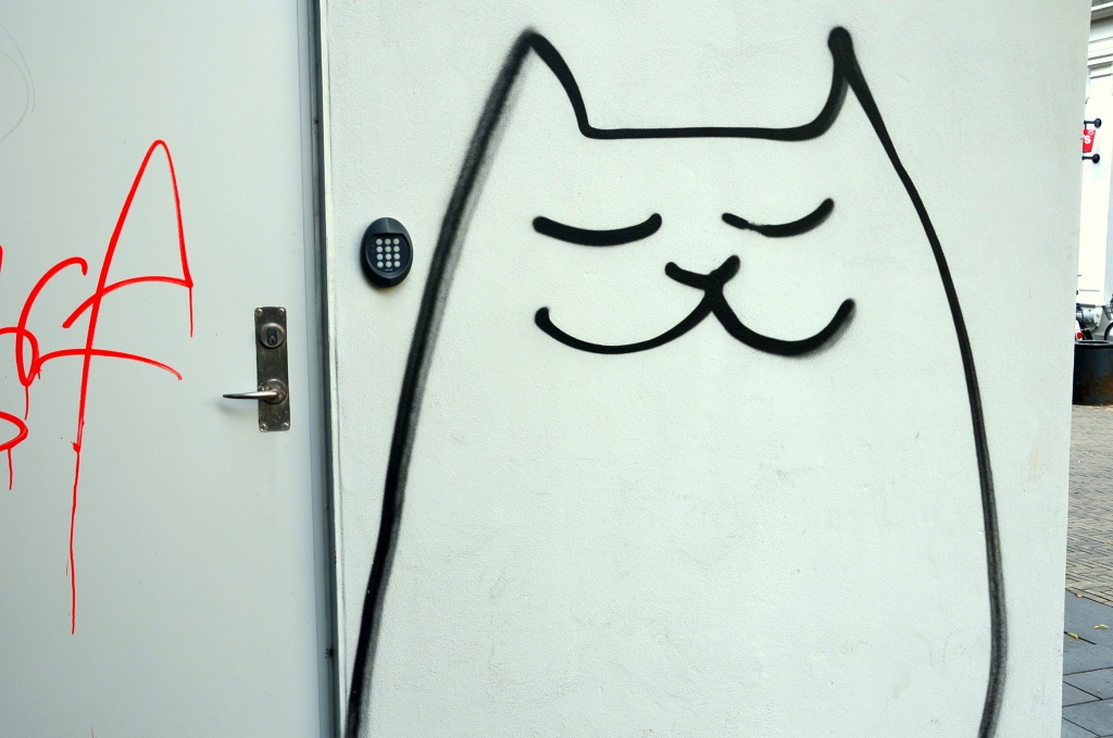 Super sød kat på væggen på gågaden i Odense. Den minder lidt om Simon’s cat synes jeg (for jer der ikke kender til Simon’s cat, skal I lige klikke på linket og se et par afsnit).