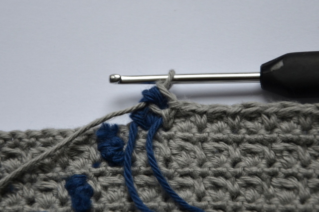 I mellem hver bobbel er der en fastmaske. Lav en fastmaske i grundfarven.