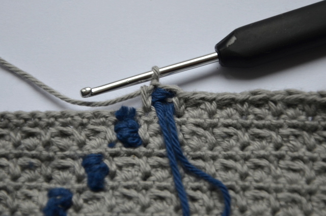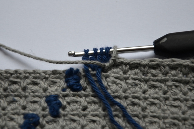 Hvis man kigger rigtig godt efter vil man kunne se de blå snore som er inde i det grå område på de 3 første rækker. Det ændrer sig i de senere rækker, da jeg fandt ud af teknikken.