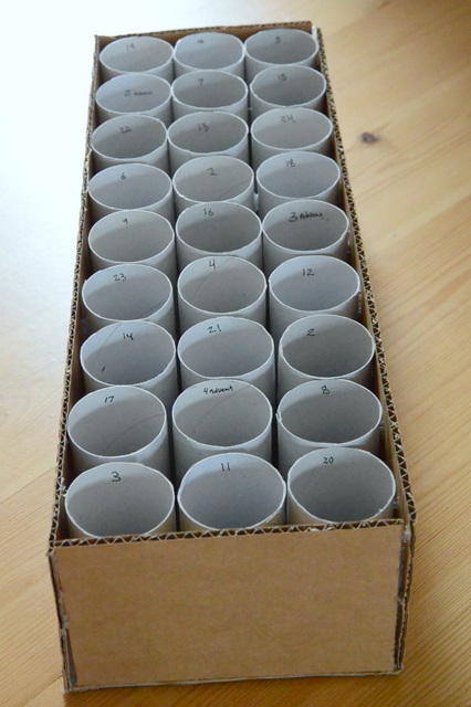 Jeg havde tankerne et andet sted, da jeg lavede papkassen til rørene, så der kom 3 rør for meget i(27 rør). Så var jeg 1 rør i underskud. Så den endte med at blive limet op på toppen af kalenderen